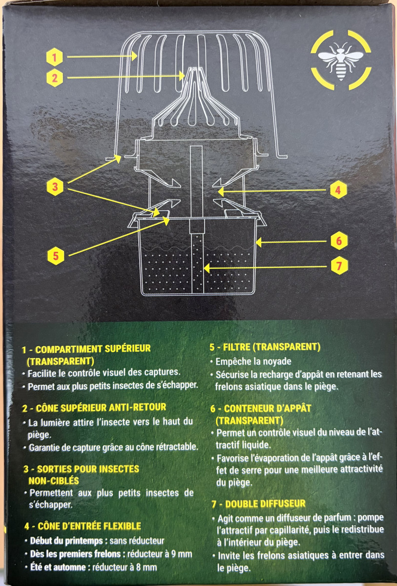 Les ouvertures du piège ont été étudiées pour laisser s’échapper les insectes plus petits, contribuant ainsi à limiter l’impact sur les pollinisateurs comme les abeilles. Il s’agit donc d’une solution plus respectueuse de la biodiversité que les méthodes chimiques.
